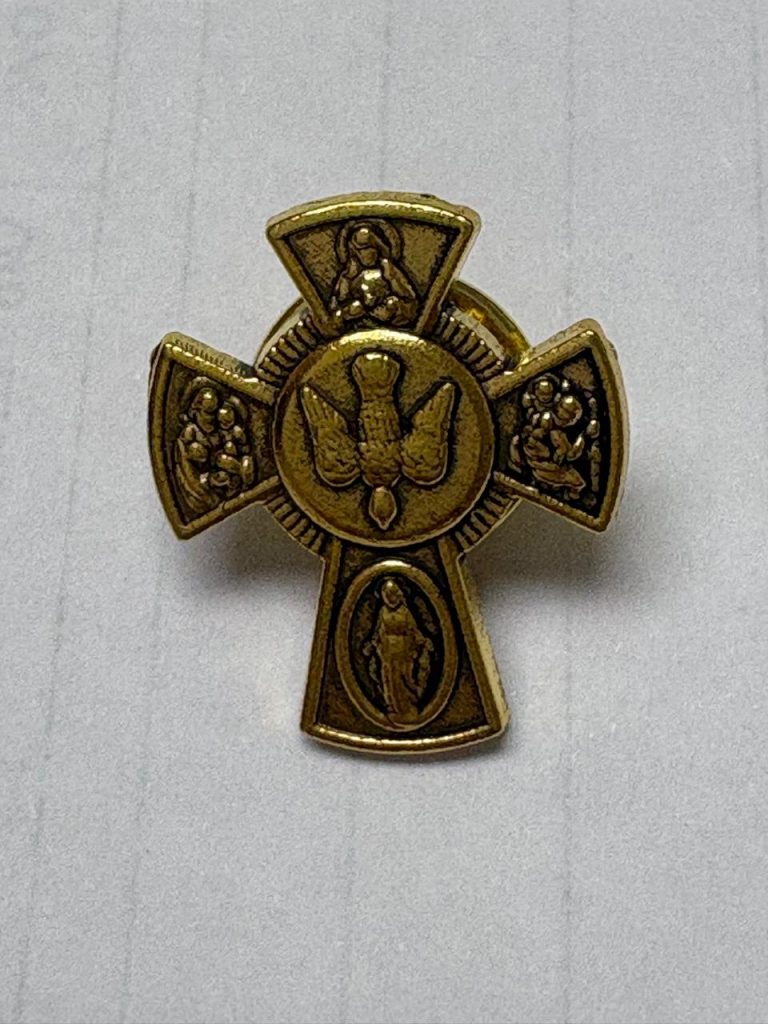 Es una cruz de 2 x 1.75 cm. —pequeña, pero profundamente significativa— que reúne en su centro la imagen del Espíritu Santo, Aquel que guía, fortalece y sostiene la misión de la Iglesia en medio de la adversidad.